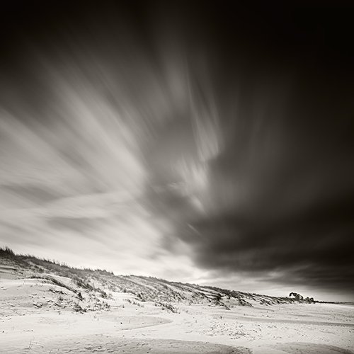 • Black and white photograph by Bernard Donjean that shows the shape of Mont-Saint-Michel under a broken clouds sky (name of the photograph : Broken Clouds)